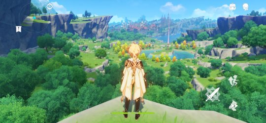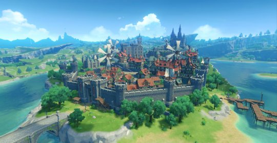 蒙德被群山与田野围绕,景色丰盛多变:「苍风堡垒」地形较高,过路的旅人常听见悠长的狼鸣;「风啸山坡」拓宽至海岸,在浅滩与海面之上,常有苍鹰回旋;「明冠山地」由明冠峡、风龙废墟构成,后者壮阔而神密,要想一研究竟,还需解开机关才行;「坠星山谷」则是蒙德城的所属地,此地的千风神殿,现在只剩残留的废墟,诉说着千百年前的传说。