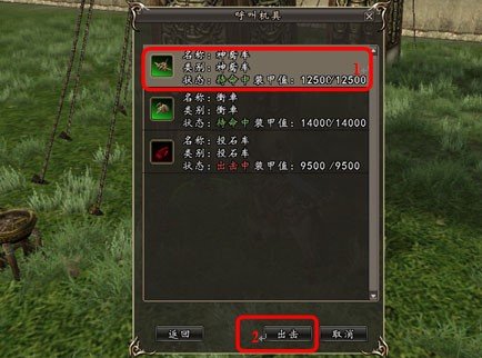 1. 陆战机具可在本方权势城池、据点、海港外的军械库向NPC【车府令】对话通话机具。