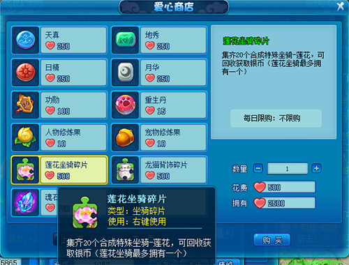 那莲花座骑究竟要如何得到 呢?说难吧其实也不会太难。大伙儿都了解莲花是观世音菩萨的座骑,莲花台变成观世音菩萨的一种意味着标记,想起它大家心中当然会闪过救苦救难和心存大爱的场景,因此要得到 莲花座骑,务必广献爱心,在得到 一万点爱心以后,能够在爱心店铺一口气买下二十个莲花座骑碎片,随后生成得到 莲花座骑,赚取一万点爱心是一种悠长的流程,须要有充足的耐性和真实的爱心。