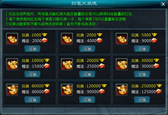 在活动界面,将充钱点数换取为特定总数的金币,就可以得到 相对总数的红包返现。更有首冲随意金额即送价值千元长期座骑“南柯一梦”奢华奖励。