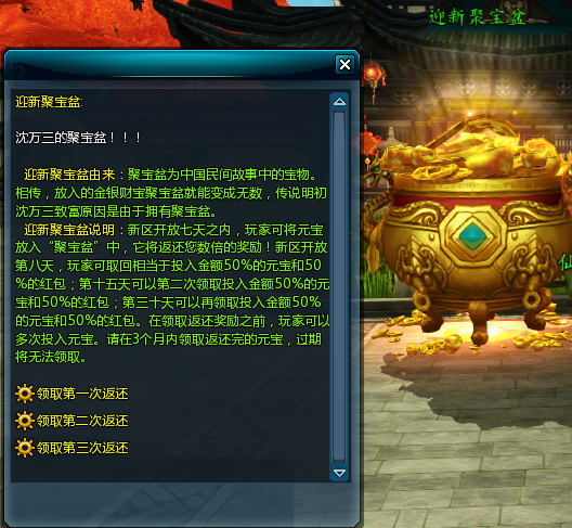 热血传奇手游全部全力于复原正宗的修仙世界,此等传说中的宝贝又如何少得了。新区开启7天内,参与者可付出自定数额的金币至聚宝盆内,能够将于第8天、第15天、第30天返还肯定占比的投资奖赏,总共将得到 包括本金在内150%的投资奖赏。付出越多,收益越大!