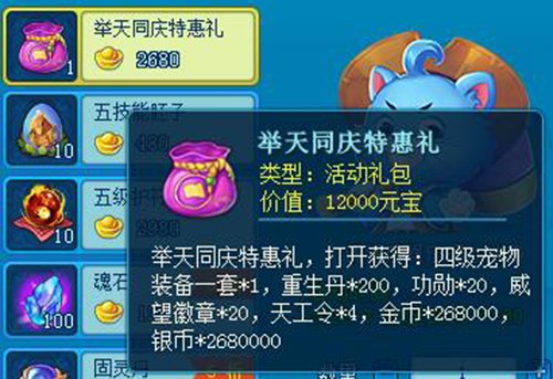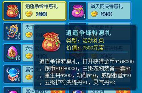 逍遥争锋特惠礼和普天同庆特惠礼中内含金币、银币、再生丹、宠物装备、荣誉、声望徽章等常见的特技,价钱能够说是格外亲民实惠的。此外,限定时间商城中也有各式各样别的折扣产品,有须要的少侠,就请畅快购买吧!