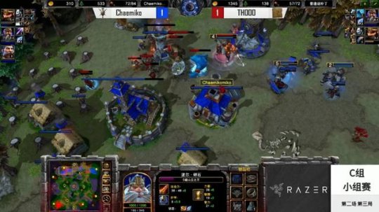 第三局,地形图赶到LR,人族内部战争,Chaemiko首发大法师,速开二矿。TH000接连影响对方分矿并没能打出成效,反被对方围杀。TH000减慢节拍,开出二矿,运用野怪打乱对方阵容,反面击退对方主力,扳回局势。后阶段TH000开三矿,与对方经常互换战损,互有得失。最终TH000攻入对方分矿,尽管山丘率先被围杀,但换掉对方部份战力,最终Chaemiko经济断裂,无兵再战,只有打出GG。最后TH000以2:1的比分取得胜利