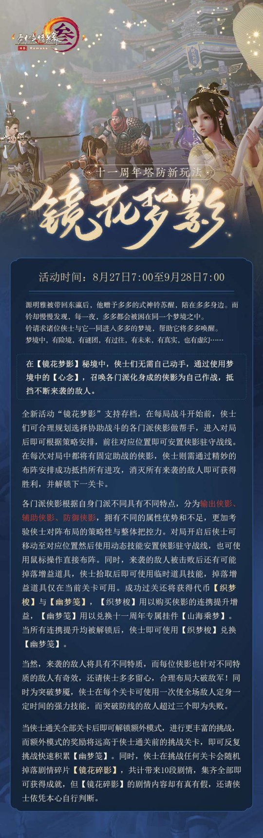 集轻轻松松、兴致、益智、对策于一身的十一周年崭新塔防类活动“镜花梦影”今天宣布现身!且说源明雅被带回东瀛后,他赠送多多的式神铃清醒,昼夜陪在多多身旁。而铃却渐渐发觉,每一夜,多多都是被困在同一种梦境当中。因此铃恳求各位侠士与它一同进到多多的梦境,协助它将多多唤起。然而在这梦境中,有险境,有谜团,有过往,有将来,有真正,也是有虚幻……