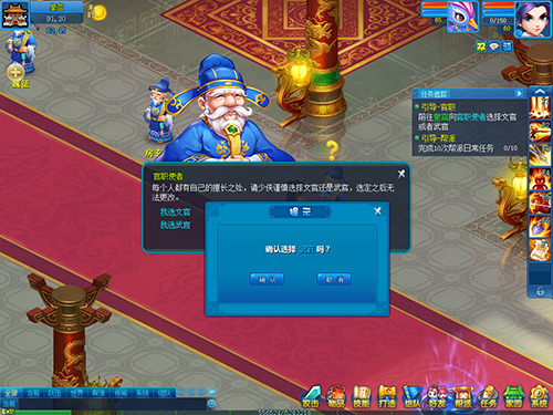 逍遥世界把官职分成文官和武官,少侠在挑选前肯定要掂量本人的需求和优点,一旦选定官种就不可以变更了。喜念书善智谋就做个文官,武功精能杀敌就做武官,无论是文官還是武官都同样能保家卫国、升官发财,少侠肯定要挑选本人喜爱的呀,那样才可以拼劲十分充足,早日完成官居一品的理想。
