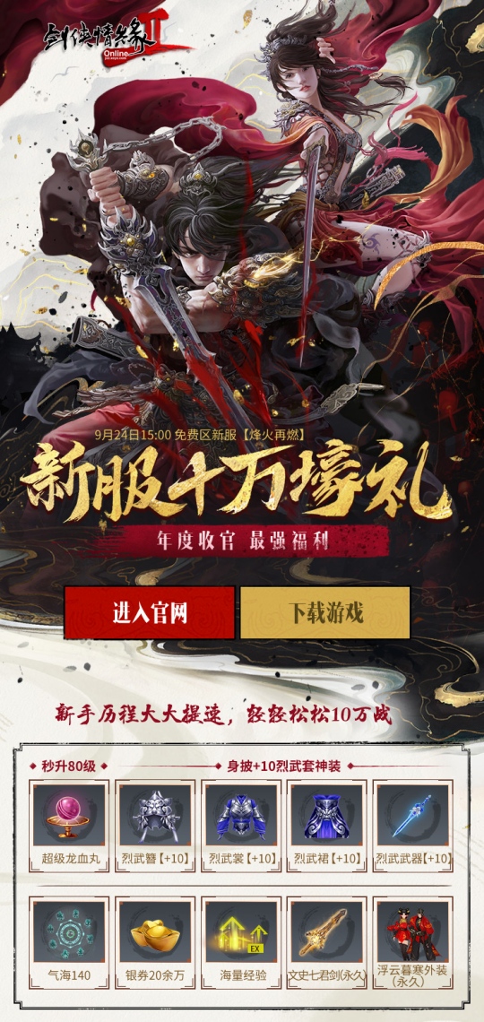 新服十一大活动奖励全方位升級!预定领烈武法宝、抱团秒升80级、刷活跃得飞剑、豪送银券、经脉、仗剑令等奖励,轻松全套烈武装备、140级经脉。年度最强新服奖励,万万别错失了!