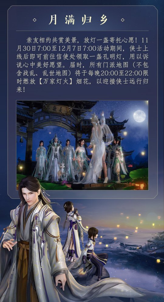 温情满满邀君共度,亲友相约共赏美景,放灯一盏寄予愿望!11月30日7:00至12月7日7:00活动期内,全部侠士发布后皆可前去信使处领到一盏可無限次应用的孔明灯,侠士可将愿望向其倾吐,并放飞祈福成真。明灯盏盏,寄万家愿望,灯火绵延点亮夜空,更将幸福的祝愿放飞,随风游遍鼎盛大唐,让真心实意的祝愿撒向这锦绣山河!孔明灯将于12月7日7:00消退,还请诸位侠士留意。