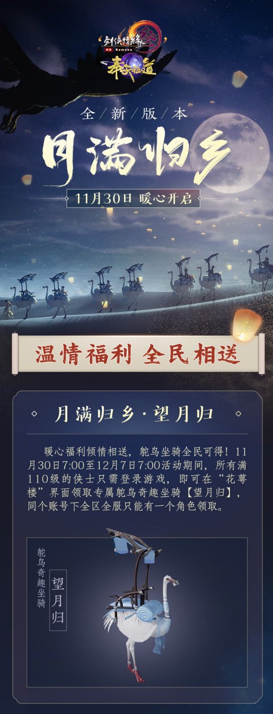 贴心奖励倾心相送,鸵鸟座骑全员可得!11月30日7:00至12月7日7:00活动期内,全部满110级的侠士只需登陆游戏,就可以在经营活动界面“花萼楼”领到专享鸵鸟奇趣座骑【望月归】!资讯君在此提示,同个账号下全区全服只有有一种人物领到,还请诸位侠士留意。