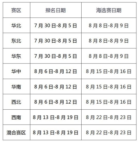 7月30日至8月23日为城市海选赛时期,每星期将依此交叉开展各个赛区的报名,并在周末以赛区为企业开展猛烈的城市海选赛!实际赛程详见下方表格,有心愿参与比赛的参与者能够参加所属城市的QQ群资讯管理员开展线上报名,也能够在QQ中找出队友进行组成队伍,一同角逐荣誉!