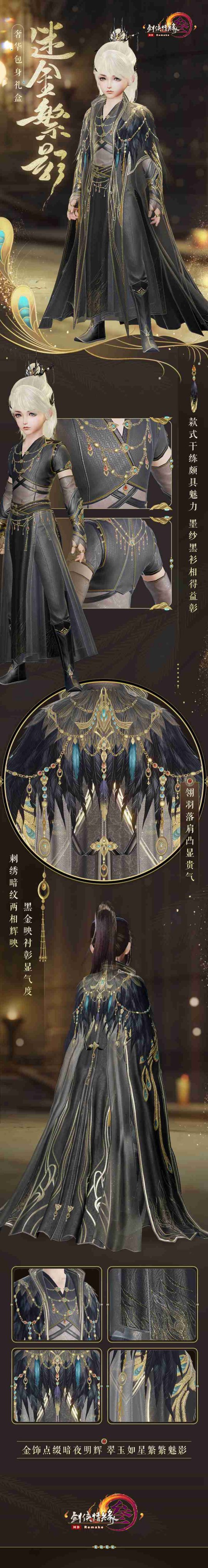 女款设计显出体态,玄色为底金丝勾勒,细腻描写雀翎纹案,明暗相替宛如流星掠过夜空,又似流火点亮漆黑。裙摆处黑金交相绣出的孔雀翎羽纹样华美大气,突显别样吸引人的力量!两袖选择栗色半透明材质面料给人以若隐若现之美,配搭精致金饰,雀翎式样镶嵌祖母绿,举手投足间全都是高贵雍容的贵族气场!披风包身以薄纱掩映,壮丽与美好并存,延展出的雀翎金丝绣更将异域贵族追崇孔雀这一富贵吉祥的幸福像征表现得酣畅淋漓!成女款选用雅致长裙礼服样式尽显异域吸引人的力量,萝莉款则以短裙凸显灵动俏皮,更具童趣讨人喜欢!