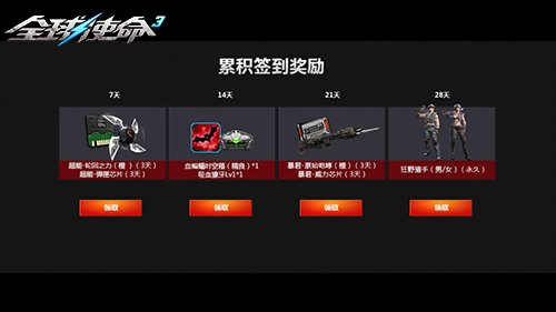 当你持续打卡7天/14天/21天/28天和,就可以到页面领到相对的超能-循环主力、超能=丹霞芯片、暴君-原始怒吼等奢华法宝大豪礼。积累打卡不掉线,持续28天打卡的微信关联参与者,更有羡煞旁人的长期服装狂野猎手(男)/(女)免费相送!对应的打卡奖赏将于隔日下午12点自动发放到您的邮箱内,请留意查收。