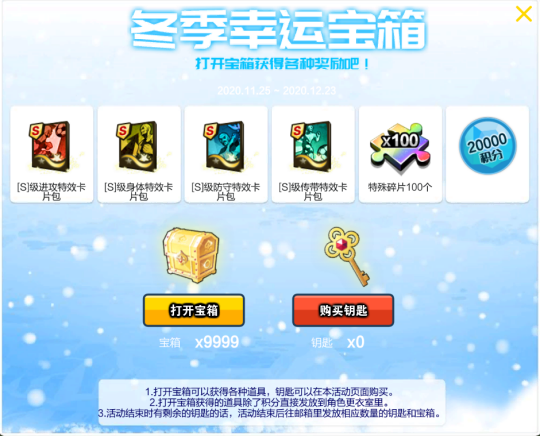 限定时间打开的最强物资——好运宝箱11月25日强悍重归! 四种冬天特供S级效果卡片包、独特碎片及大量累计分数豪礼尽在好运宝箱中!