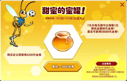 重要奖励,超量返点!甜美的蜜罐活动将于11月25日贴心发布!只需3900点券就可以马上得到 4200代金券返还,外加七天的随机金额代金券领到机遇,最高可得到 58888代金券!祝诸位FSFER都能获得满满代金券奖励!
