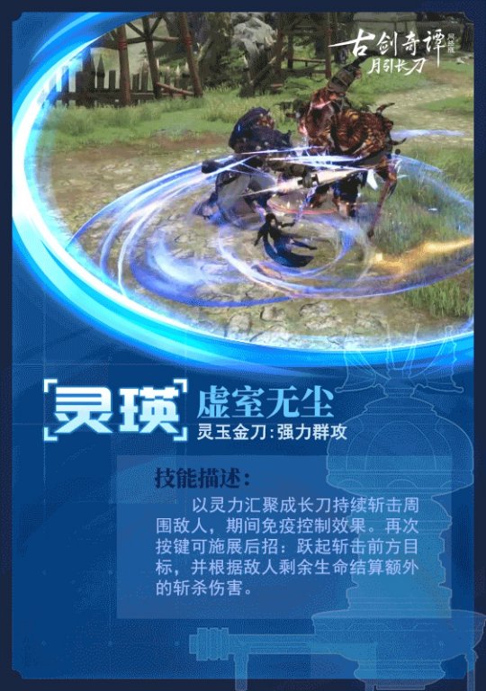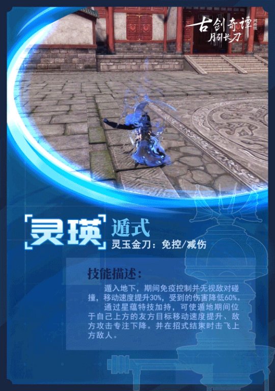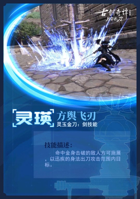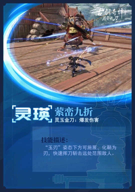 除了应用傳統的珑瑛长刀技法,灵瑛可令手中长刀形状出現短时间内转变:在灵玉金刀专精下的这一式“萦峦九折”,能化鞘为刀,双手持握,对对手开展强力的攻击。