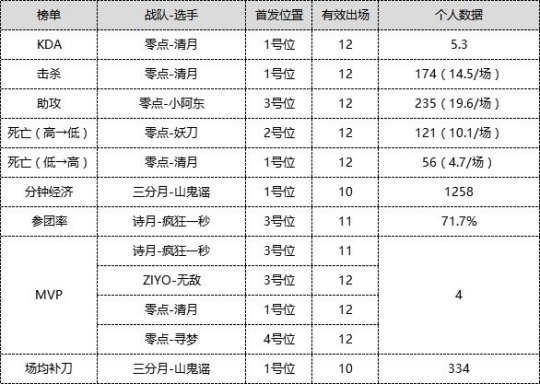路过12个赛事日的交战,各项选手数据TOP10榜单再度更新。零点战队自开赛以来全部维持强悍霸榜的姿势,占有6项榜单第一名的地址,5名队员所有上榜。1号位清月早已持续三周稳坐击倒、KDA双榜榜首之位,同一时间也是开赛迄今阵亡次数至少但得到 MVP次数顶多的一位选手,堪称本赛季现阶段发挥最为优异的名人选手。