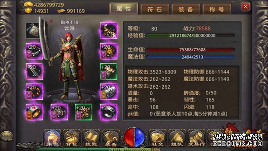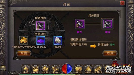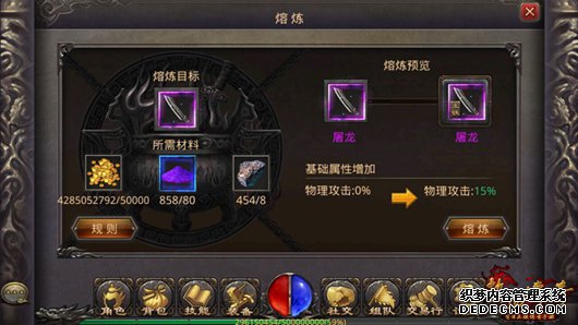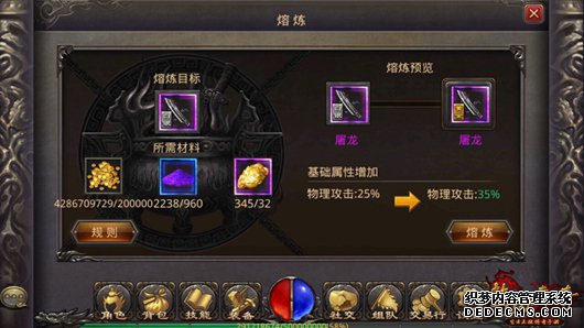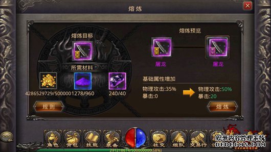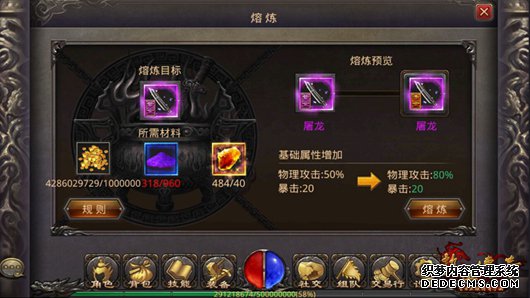 使用熔炼精华和紫金矿石可以将黄金屠龙熔炼到紫金屠龙,战斗力由7896提升到8392,物理攻击提升到708-1770,增加50%,整体战斗力由80562上升到84746,战斗力增加了4184点,这是一个很大的突破。最重要的由黄金到赤金,暴击点数增加了20,这是一个质的飞越,20个暴击点数的潜在威力对敌方的伤害都是致命的。