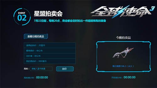 7月22日起,每晚20点,国联星际商会都是定时拍出一间非常稀缺的装备。参与者可应用任务关得到 的星币参加拍卖。最先,登陆官网活动页面查询对应特技的起拍价和最高进价,在这个区间内輸入你的竞拍星币总数,每人只有1次出价机遇哦!次之,参加竞拍期内所应用的星币可能会被临时扣除,待竞拍完毕后,21点可见到获奖讯息。若你最后得到 大奖,则长期扣除相对星币,反之则返还竞拍星币。即便你对今夜的拍卖品不感需求,但对这般盛况空前的星盟拍卖会,何不揣下手里的星币凑个繁华?或许能收益比平常更优惠超值好礼。