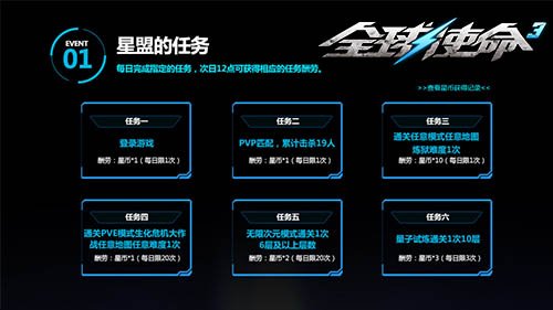 活动期内,参与者可登陆活动页面接取星盟的特定任务。要是进行星盟任务,隔日12点就能够得到 相对的星币报酬。任务包含PVP配对,总计击倒19人;PVE方式地狱困难程度随意地形图通关1次;量子试炼通关1次10层等。须要留意的是,从任务一上任务六,每天参与者只有进行1次,超出次数后程序将不附加发放星币。到底星币有哪些用呢?让大家接着看下来。