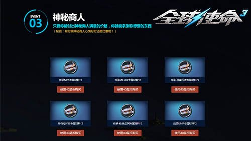 在国联星际产品会举办的期内,神密商人会带着传承MP5的专享材料、战灵UMP专享材料等枪支专享材料光顾这儿。参与者能用相对的星币向神密商人选购特定的特技,这儿告知大伙儿一种秘技,有时候神密商内心情好时还能给出特技优惠哟!神密商人的产品每件只有选购1次,待每天零晨0点页面后更新后可再次选购。