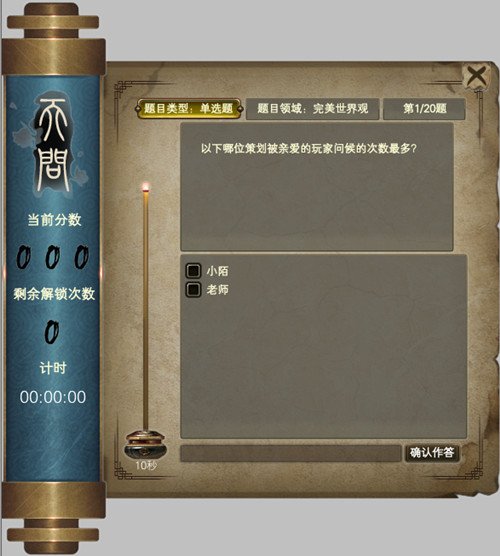 每星期一12:00至22:00,相符标准的勇士可前去剑仙城(428,892)、万化城(242,646)、积羽城(334,435)处找寻【楚汨】参加“天问·寻根究底”。此时期共有20道标题,每道标题都有倒计时,答错或超时不得分,答对按剩下時间计分,至少5分,顶多10分。总分≥60就可以得到 参加第二时期“天问·坤舆阵图”的资质。