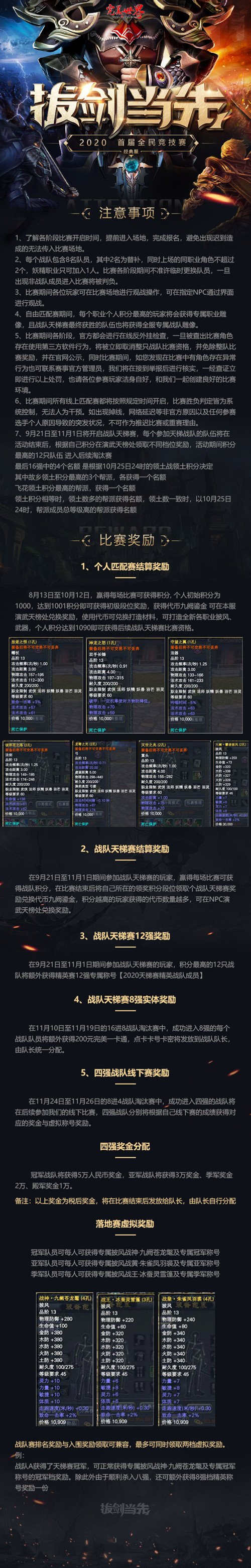 首届著名服全员比赛赛将于8月13日宣布开幕,赛事以6V6对决方式开展,分成不受拘束配对赛、战队天梯赛、十六强分组赛、八强取代赛、线下总决赛五个时期。参与赛事的勇士在每一个时期都能够得到 对应的奖赏,四强战队还将参与官方安排的线下赛事,并依据线下赛分数得到 对应的赛事奖金及宝贵游戏特技。