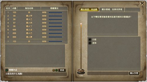 得到 第四时期参加资质的勇士可在【楚汨】耗费凭据进到城南室内找寻书案参加第四时期比拼。第四时期分成出题环节与答题环节。出题环节时,全部勇士挑选除本身外的随意一名勇士,将标题出给他。全部勇士出题结束后入入答题环节,被出题的勇士开展答题,别的勇士等候。全部勇士答题结束后再一次进到出题环节,依此类推反复。答题环节时,勇士答题不正确或超时,本身扣减性命值,扣减量为标题的最大分值;答题恰当,则发送此标题的勇士扣减性命值,扣减量为答对该题得到 的分值。每道标题都有倒计时,答对按剩下時间计分,至少10分,顶多20分。每位勇士初始有着160点性命值,当勇士性命值归零时即被取代,程序将按全部勇士的取代次序分辨名次。