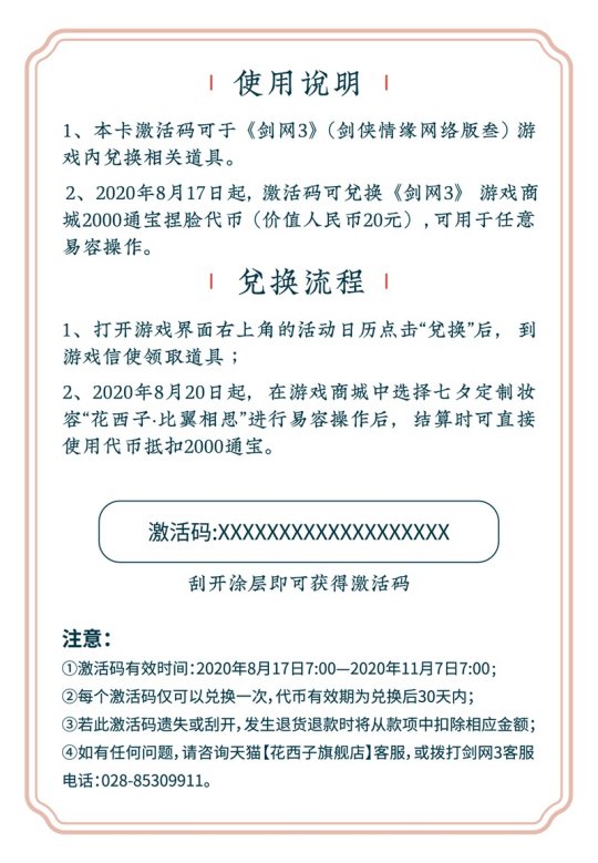订制雕花口红颜色靓丽,如今抢购也有特惠奖励!11月1日前,侠士每选购一支“比翼相思”七夕订制雕花口红,就可以随货附送2,000通宝易容专享代币,以供侠士随心打扮您的容貌,多买多得哦!通宝代币将以激活码卡片方式与侠士购买的口红一同发货,激活码换取合理期为今年8月17日7:00至今年11月7日7:00,代币换取成功后30天内为合理期,还请侠士们留意查收,万万不必错失换取限期呀!除此之外在8月20日“比翼相思”同款订制妆容也将协调一致上架商城!七夕佳节,花剑协同,与卿浓情蜜意,与卿仗剑天崖!