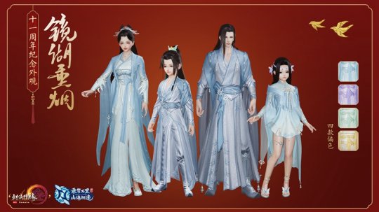 十一周年龄念外装“镜湖垂烟”:十一周年龄念外装礼包应用后,可选择“镜湖垂烟”4款偏色中的当中1款获得。