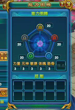 能试图腾是以图案的方式立即的向参与者呈现出座骑对参与者能力加持角度的1个工具。图腾由里外两个五边形组成,五边形的5个点各自比较应5种不同的特性:能量、元神、灵巧、身体、筋骨。