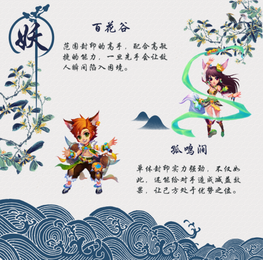 【妖】禽兽草木修炼可成妖,无欲无求。善于封印,行動讯敏,而且能对对手导致减益成效。