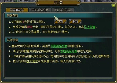 7月1日至7月30日期内,本月万宝阁活动如期打开。参与者单笔充钱每满1000金币就可以得到 1枚符钱特技。符钱不能做为游戏内买卖货币应用,但能够用于换取或抽取万宝阁之中的特技。本期特稀缺大奖有10阶御灵座骑狂风蚀日、三天技噬地、三天技翻羽、三天技穷奇、三天技穷奇、三天技哮天犬、和元灵精魄、神兽精魄等好礼,为诸位道友送去贴心奖励。