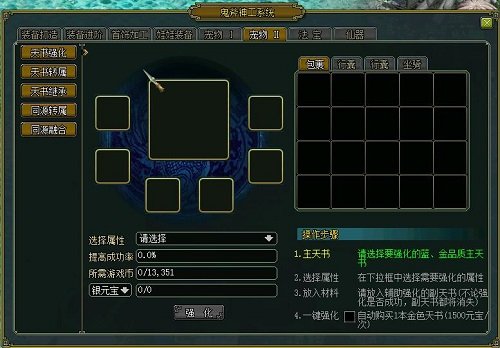 天书程序还能够在巧夺天工宠物II页面中开展强化、接受和变换等操控。当中,级别大于100级且质量为蓝、金的天书能够对根基特性开展强化和提升,一次顶多可放入6个輔助天书,且强化后輔助天书消退,而根基数值将获得肯定水平的提升。此外,假如参与者对随机转化成的根基特性不称心,则能够根据天书转属作用将不称心的特性更换,也便是天书转属操控。