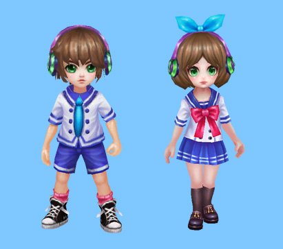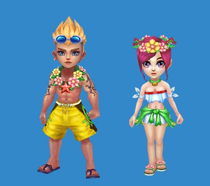 这套服装取材自海滩装,主打清爽和狂野特点。男性有一头非常赛亚人般的冲冠直发,头戴游水镜,身穿海滩裤,脚上则是木屐,一股浓浓的海滩达知名度息扑鼻而来;女士则是头戴花环,身穿草裙,简易而言便是常见的巴厘岛裝飾,让你变成人见人爱的草裙舞皇后。