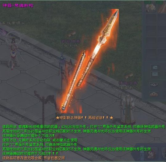参与者主动参加国战,也有征途影片同款法宝——楚魂断枪等你拿。满级可得到 50万双攻、双防和血量加持,并将楚魂断枪修复为详细的楚魂枪!让你威武神气的同一时间,你将有着楚魂的神力附体,变成保家卫国、受人景仰的英雄!除此之外根据新区百环包、重宝刺探和重宝运镖等打法及奖励也可得到 楚魂断枪法宝碎片!