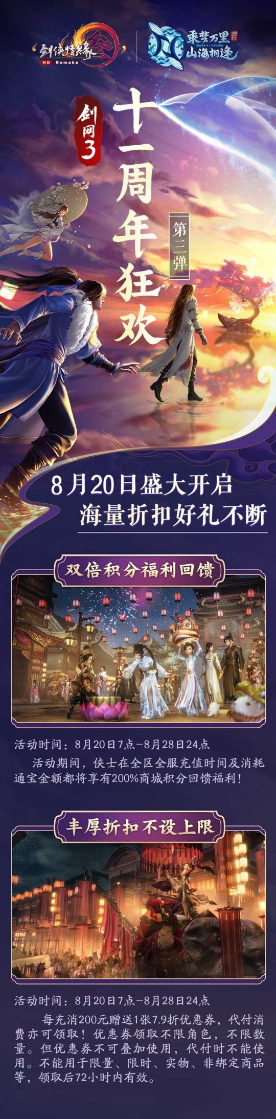 昨日产生的周年狂欢第二弹想来早已引燃了侠士们的激情,而第三弹狂欢活动也已蓄势待发,今天资讯君就为大伙儿抢鲜爆料!8月20日7:00至8月29日0:00活动期内,侠士在全区全服花费均将得到 二倍累计分数反馈的奖励!同一时间,侠士每充消200元就可以获赠一张7.9折优惠券且无限制,代付花费也可领到!优惠券自领到后72小时内合理,领到将不限人物不限总数,但不能累加应用,代付时不能应用,且不能用于限量、限定时间、商品与非关联产品等,还请侠士们留意!对于侠士们希望已久的周年多彩好礼,资讯君也将相继为大伙儿公布,敬请希望!