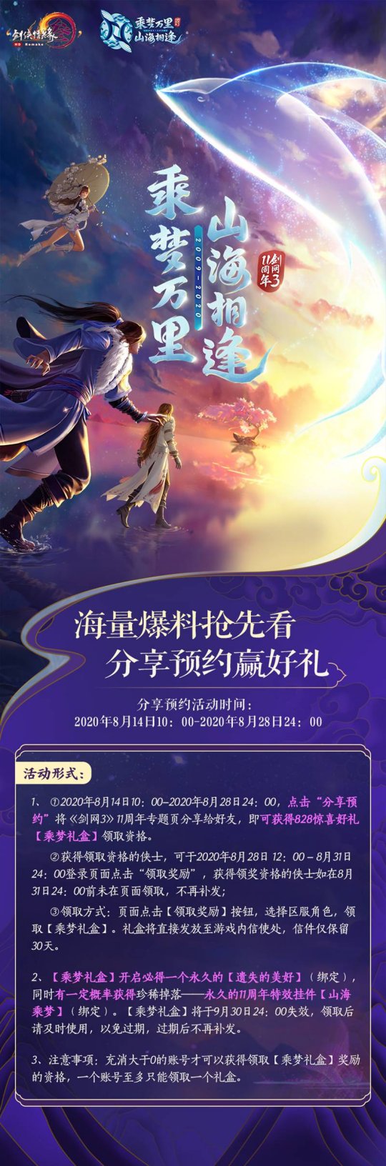 乘梦万里,山海相遇!大量奖励活动伴你共庆热血传奇十一周年!大量周年狂欢活动的精采爆料将要在后续一一发布,邀请侠士多多重视,敬请希望!