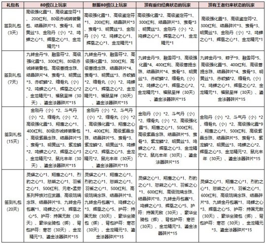 打卡有礼,奢华座骑。8月21日9点至9月14日24点,级别≥80级(觉醒不受限定)的参与者。每日日历打卡可得奖赏,打卡3天、7天、15天、20天各可得到 一种活动豪礼,心腹参与者有附加奖赏。参与者每日打开活跃值铜宝箱能够得到 一种关联的野猪愁奖赏(绿色服无野猪愁奖赏)。