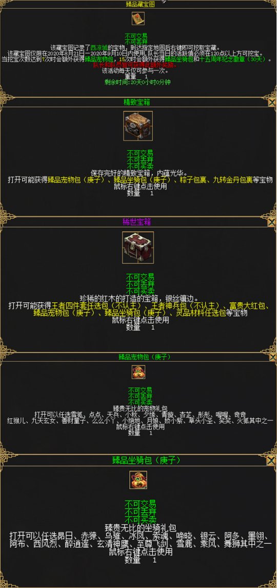 有着“重归著名”恐怕“王者回归”情况的参与者每天去西凉城的张岩(100,154)领到一张臻品藏宝图。当天活跃值超出120的参与者做为队长(无级别限定),和一位级别80级好面(觉醒不受级别限定,新服不受级别限定)的参与者,开展双人组成队伍,在西凉城随意地址,心腹参与者右键臻品藏宝图就可以挖宝得宝箱。挖宝必得1000银两,也有机遇得到 王者四件套任选包、王者神兵包、富贵大红包、富贵红包、臻品宠物包(庚子)、臻品座骑包(庚子)、灵品材料任选包等奖赏。