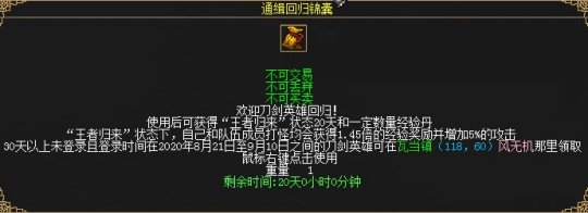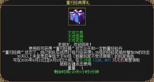 20年8月21日9:00-20年9月10日24:00,超出30天未登陆游戏的80级及好面(新服领到奖赏不受级别限定)的“刀剑心腹”,重归发布后能够在瓦当镇风无机处领到“重归著名”特技一种(应用合理期20天),应用特技得到 “重归著名”情况,该情况参与者恐怕与此参与者组成队伍的参与者可能会得到 1.35倍的杀怪经历,情况成效不断20天,而且每日发布就可以得到 15点活跃值。并给队员和本人加3%物攻、3%元攻加持。