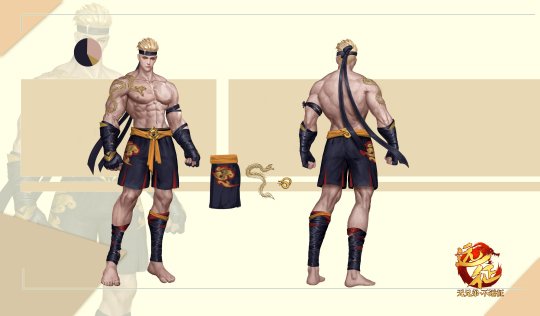一梳金黄大背头,剑眉冷眼,长细蕴含着锋利的黑眸。面部棱角明显,鼻梁高挺,妥妥的10分长相!金色盘龙纹身显得纤长的身型更加显眼,健壮的肌肉全是能量的美感。黑拳套,黑短裤和黑护腿,甚有几分拳皇东丈的滋味。腰间橙带恰如其分地把半身黑色给盘活了,冷峻不乏威势,格外讨喜的人物形像!!!
