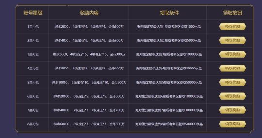 著名第3重奏: 老账号评定星级,星级越高,可领的奖赏越丰富,4~8级宝石、4~8级魂玉、大量金币、大量关联水晶,一次性领取手软!