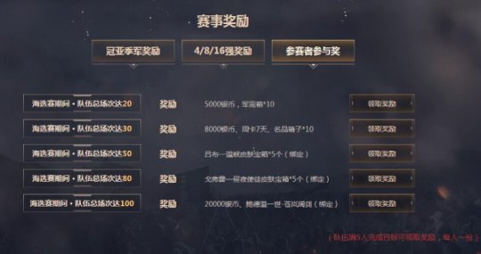 在海选赛完毕后,全部参赛战队成员将依据海选赛期内战队总胜场数得到 对应的奖赏奖赏!当中包含:银币、军需箱、名品箱、周卡、皮肤宝箱和鲍德温一世·苍岚阔剑!
