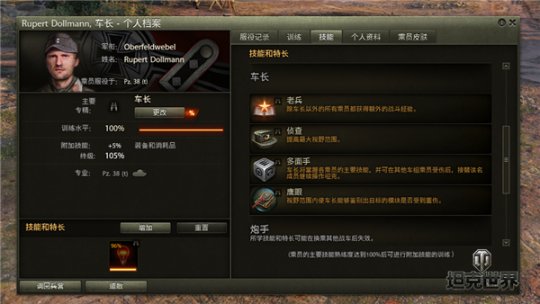 与坦克同样,乘员在感受作战后,一样能够得到 经历,而当坦克开发了全部配件后,还能够把坦克作战后所应得到 的经历,根据选项来赐与乘员,加快坦克手们的塑造和成才。