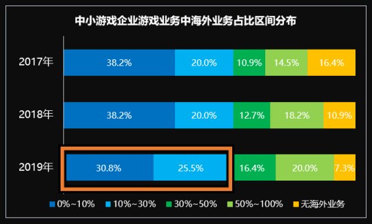 根据中小游戏公司国外业务占比区间遍布图能够看出有三分之一的公司比重在10%下面,2017年~去年,国外业务占比超出30%的中小游戏公司提高了11%,变成其关键主运营务,同一时间未涉及国外业务的公司慢慢降低。