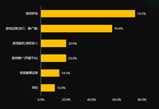 在关键业务方面,有游戏开发业务的公司占比为74.5%,有游戏经营业务的公司占比为56.4%。除此之外,有游戏版权/受权收益及游戏推广(买量平台)业务的公司占比均为20.0%,有电比赛事经营业务的公司占比为14.5%,和有游戏硬件配置销售等别的业务的公司占比为10.9%。能够看出,现阶段中小游戏公司中关键业务种类关键以游戏开发和经营为主,由于产业环境的转变,买量早已已不是中小公司的关键业务。