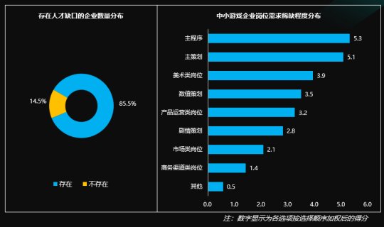 在人才空缺上边,有85.5%的公司存在人才空缺。从存在人才空缺的公司的职位要求来看,涉及商品开发层面的高档技术人才稀有水平最高,如主程序和主策划;次之,美术类、数值策划和商品经营类也是稀有水平较高的职位。