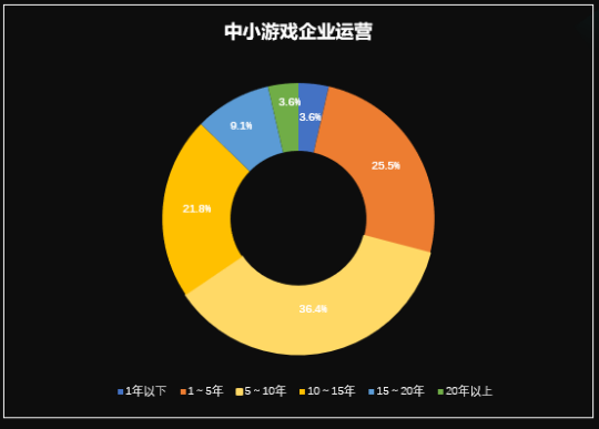 次之,从公司经营时长方面看,在此次调研的中小游戏公司中,经营时长5~10年的公司总数顶多,占比36.4%,经营5年好面的公司总占比做到了70.9%,表明中小公司总体发展态势优良,具有肯定的能力。