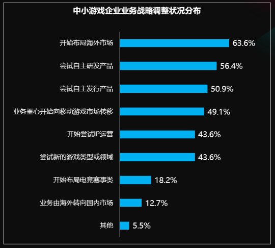 在近几年的发展流程中,依据游戏市场转变,中小游戏公司更趋向于多方面战略设计,不同战略紧密联系,当中63.6%的公司開始设计国外市场;超出50%的游戏公司试着独立开发和发售商品。