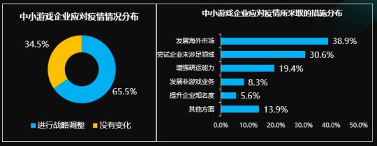 为了解决疫情,中小公司主动变化构思,积极求变,有65.5%的中小游戏公司开展了战略调度以解决疫情产生的影响。