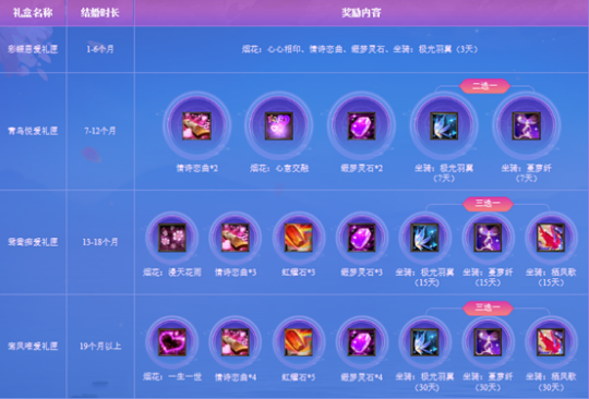活动期内,夫妇2人可组成队伍前去洛阳(139,182)月老处,领到奖赏:完婚留念礼匣。完婚時间越长,得到 的奖赏价值越高。
